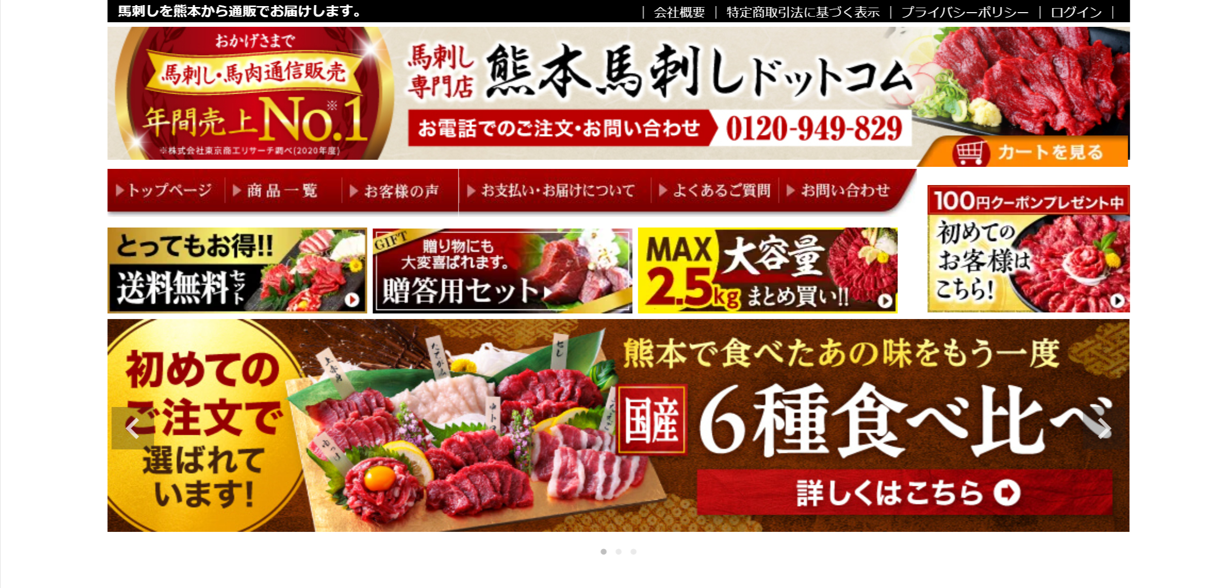 【PR】熊本馬刺しドットコム 今回ご紹介するのは、熊本から直送の馬刺し・馬肉の通販サイトです!馬刺し・馬肉は鉄分豊富、カロリー、高たんぱく!馬刺しは生で食べるのでヘルシーなのはもちろん、馬肉は健康的な食事としても注目されています!★おすすめ★・ご自宅用としてご家族や友人との御馳走に・お家用の贅沢な晩酌のお供に・父の日や母の日のプレゼントに・お中元やお歳暮に送料無料の盛合せセットもあるのでギフトにおすすめ!好きな部位や人前に合わせてお選びいただけます。詳しくは下記バナーをクリック↓ 今回ご紹介するのは、熊本から直送の馬刺し・馬肉の通販サイトです!馬刺し・馬肉は鉄分豊富、低カロリー、高たんぱく!馬刺しは生で食べるのでヘルシーなのはもちろん、馬肉は健康的な食事としても注目されています!★おすすめ★・ご自宅用としてご家族や友人との御馳走に・お家用の贅沢な晩酌のお供に・父の日や母の日のプレゼントに・お中元やお歳暮に送料無料の盛合せセットもあるのでギフトにおすすめ!好きな部位や人前に合わせてお選びいただけます。詳しくは下記バナーをクリック↓ 詳細はこちらをクリック ◎こだわり 1, 厳格な衛生管理 加工場は国際的な管理システムに対応しており、徹底した衛生管理のもと厳しい検査をクリアした馬刺しをお届けしてくれます。 加工場は国際的な管理システムに対応しており、徹底した衛生管理のもと厳しい検査をクリアした馬刺しをお届けしてくれます。 2, 50gずつ小分け包装 1人前の小分けパックを採用。解凍時間はたったの10分で、すぐにお召し上がりいただけます。 1人前の小分けパックを採用。解凍時間はたったの10分で、すぐにお召し上がりいただけます。 3, 真空パック、 急速冷凍を採用 3, 真空パック、急速冷凍を採用 加工から間髪入れず急速冷凍を行うため、新鮮で極上の馬刺しを熊本からお届けしてくれます。 加工から間髪入れず急速冷凍を行うため、新鮮で極上の馬刺しを熊本からお届けしてくれます。 ◎おすすめ商品 >> 送料無料セット >> 馬刺し 送料無料セット 6種食べ比べセット 華約280g(約6人前)5,980円 【送料無料】 人気部位を一度に楽しめるおすすめ6種類の馬刺しお試しセット。・口の中でとろけ、旨みが広がる 「霜降り(中トロ)馬刺し」・定番の甘味が美味しい「赤身馬刺し」・独特の食感の「たてがみ刺し」・やわらかい「馬ロース馬刺し」・貴重な「馬刺しユッケ」・コリコリ食感の「ふたえご馬刺し」 人気部位を一度に楽しめる、おすすめ6種類の馬刺しお試しセット。・口の中でとろけ、旨みが広がる 「霜降り(中トロ)馬刺し」・定番の甘味が美味しい「赤身馬刺し」・独特の食感の「たてがみ刺し」・やわらかい「馬ロース馬刺し」・貴重な「馬刺しユッケ」・コリコリ食感の「ふたえご馬刺し」 【厳選】特上赤身2種セット約300g(約6人前)6,980円 【送料無料】 どの商品を選んでいいかわからない方にまずおすすめしたい、赤身の中でも上質な部分を厳選した「上赤身馬刺し」と、肉質がきめ細かい上非常に柔らかく口の中でとろける食感を感じることができる「馬刺しロース」のセット。 どの商品を選んでいいかわからない方にまずおすすめしたい、赤身の中でも上質な部分を厳選した「上赤身馬刺し」と、肉質がきめ細かい上非常に柔らかく口の中でとろける食感を感じることができる「馬刺しロース」のセット。 熊本馬刺し 大満足セット約300g(約6人前)10,980円 【送料無料】 部位ごとの柔らかさの違いを堪能できる人気の5種をたっぷり詰めた大満足セット。・赤身の中でもやわらかい「馬刺しロース」・お口の中でとろけ、旨みが広がる 「霜降り(中トロ・大トロ)馬刺し」・定番の甘味が美味しい「赤身馬刺し」・独特の食感の「たてがみ刺し」 部位ごとの柔らかさの違いを堪能できる人気の5種をたっぷり詰めた大満足セット。・赤身の中でもやわらかい「馬刺しロース」・お口の中でとろけ、旨みが広がる 「霜降り(中トロ・大トロ)馬刺し」・定番の甘味が美味しい「赤身馬刺し」・独特の食感の「たてがみ刺し」 馬刺し 上赤身 馬刺し(50g/パック)1,188円 脂肪分が少なく、低カロリーな、人気の部位。ダイエット中の方やお子さま、ご年配の方にも、幅広い年代の方が食べやすく、濃厚な赤身の味わいを感じられます。 脂肪分が少なく、低カロリーな、人気の部位。ダイエット中の方やお子さま、ご年配の方にも、幅広い年代の方が食べやすく濃厚な赤身の味わいを感じられます。 馬刺しユッケ(50g/パック)920円 冷凍技術で旨味をぎゅっと閉じ込め、綺麗なピンク色のユッケが召し上がれます。スライス済みだから食べやすい! 冷凍技術で旨味をぎゅっと閉じ込め、綺麗なピンク色のユッケが召し上がれます。スライス済みだから食べやすい! プレミアム三角バラ馬刺し(100g/1パック)4,280円 熊本馬刺しの真骨頂といえば、霜降り馬刺し!そんな霜降り馬刺しを、霜降りの刺しの入り具合で3段階に細かく分類して