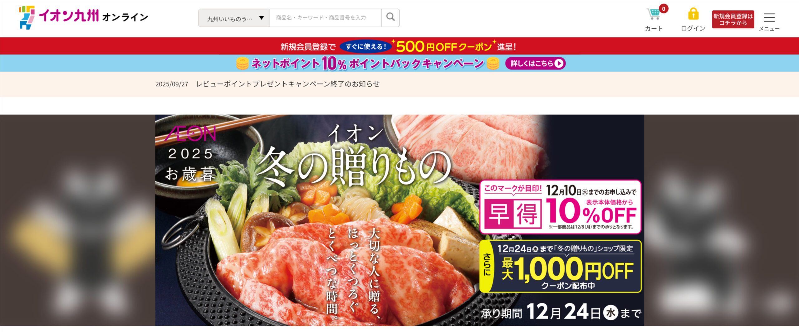 【PR】イオン九州オンライン 今回ご紹介するのは、九州の厳選された食品を取り寄せることができるサイトです!<< 九州の厳選されたいいものうまいもの >>明太子・佐賀牛・あまおう・生ライチ・ラーメンなど、地元のバイヤーが厳選した九州の食品を幅広く取り扱っています!特に野菜や果物など季節性の生鮮食品がおすすめ!おせち、お歳暮、母の日ギフトなどイベントごとに多数のアイテムが用意されており、ブラックフライデーや早割などセールが開催されることもあります!詳しくは下記バナーをクリック↓ 詳細はこちらをクリック おすすめ商品 >> お肉・ハム・ソーセージ >> お魚・明太子 >> 野菜・果物 お肉・ハム・ソーセージ 佐賀牛肩ローススライス佐賀県産黒毛和牛 500g4,612円 → 3,689円 【ブラックフライデー11月16日まで】 本体価格から20%OFF 美味しい水と澄み切った空気、佐賀県特有の穏やかな気候の中で育てられた全国屈指のブランド黒毛和牛。一眼で上質さがわかる「艶さし」と鮮やかな赤み、舌でとろける贅沢な食感と上品な旨味をご堪能ください。すき焼き、牛しゃぶしゃぶでお召し上がりいただくのがおすすめです。 【ブラックフライデー11月16日まで】 本体価格から20%OFF 美味しい水と澄み切った空気、佐賀県特有の穏やかな気候の中で育てられた全国屈指のブランド黒毛和牛。一眼で上質さがわかる「艶さし」と鮮やかな赤み、舌でとろける贅沢な食感と上品な旨味をご堪能ください。すき焼き、牛しゃぶしゃぶでお召し上がりいただくのがおすすめです。 鹿児島黒豚ギフト 7点 詰合せ9,500円 → 8,550円 【ブラックフライデー11月16日まで】 本体価格から10%OFF 7種類の商品が入ったギフトセット! 鹿児島県大隅半島で育てられた鹿児島黒豚のモモ肉を特製のタレに二昼夜漬け込み、地元産の炭で職人が焼き上げた焼豚。黒豚のモモ肉と鹿児島の海塩だけで2年以上かけて自然熟成させた生ハム。 【ブラックフライデー11月16日まで】 本体価格から10%OFF 7種類の商品が入ったギフトセット!鹿児島県大隅半島で育てられた鹿児島黒豚のモモ肉を特製のタレに二昼夜漬け込み、地元産の炭で職人が焼き上げた焼豚。黒豚のモモ肉と鹿児島の海塩だけで2年以上かけて自然熟成させた生ハム。 お魚・明太子 工場直送!出来立ての無着色辛子明太子(切れ子) 1.2kgセット (300g×4)5,000円 → 4,500円 【ブラックフライデー11月16日まで】 本体価格から10%OFF お買得な1.2kgセットです。出来立ての明太子を「生」のままお届け。48時間以上の低温熟成でぷりぷりの食感とぷちぷちの粒感をご堪能いただけます。ナマモノですので冷凍せずお早めにお召し上がりください。 【ブラックフライデー11月16日まで】 本体価格から10%OFF お買得な1.2kgセットです。出来立ての明太子を「生」のままお届け。48時間以上の低温熟成でぷりぷりの食感とぷちぷちの粒感をご堪能いただけます。ナマモノですので冷凍せずお早めにお召し上がりください。 九州産うなぎ蒲焼き真空カット薩摩川内鰻9,600円 → 8,640円 【ブラックフライデー11月16日まで】 本体価格から10%OFF 豊富な地下水と温暖な環境が鰻事業に適した鹿児島の薩摩川内にて育てました。便利な切身パックにしてお届け。小分けで真空しておりますので必要な分だけ解凍してお召し上がりください。山椒付の特製蒲焼きのたれ付き。 【ブラックフライデー11月16日まで】 本体価格から10%OFF 豊富な地下水と温暖な環境が鰻事業に適した鹿児島の薩摩川内にて育てました。便利な切身パックにしてお届け。小分けで真空しておりますので必要な分だけ解凍してお召し上がりください。山椒付の特製蒲焼きのたれ付き。 野菜・果物 極早生みかん 1箱(4.6kg)2,580円 【期間限定】 温州みかん発祥の地といわれる鹿児島県長島付近、ツルの越冬地 鹿児島県出水市で栽培された極早生みかん。木に成らす期間をできるだけ長く保つ事で糖度だけでは言い表せない濃厚な旨みと甘み、コク、2つ3つと食べたくなる美味しさです! 【期間限定】 温州みかん発祥の地といわれる鹿児島県長島付近、ツルの越冬地 鹿児島県出水市で栽培された極早生みかん。木に成らす期間をできるだけ長く保つ事で糖度だけでは言い表せない濃厚な旨みと甘み、コク、2つ3つと食べたくなる美味しさです! 紫苑+王秋 ぶどう・梨セット1.5kg 5,000円 【期間限定】 ぶどうの【紫苑】と 梨の【王秋】3玉セット!【紫苑】 ワインレッド色が綺麗で一粒が 大きくしっかりとした甘みもある品種です。【王秋】 上品な甘みと程よい酸味があり 独特な芳醇な香と優れた食感が特徴です。 おいしい2品種をお楽しみください。 【期間限定】 ぶどうの【紫苑】と 梨の【王秋】3玉セット! 【紫苑】ワインレッド色が綺麗で一粒が大きく しっかりとした甘みもある品種。【王秋】 上品な甘みと程よい酸味があり 独特な芳醇な香と優れた食感が特徴。 おいしい2品種をお楽しみください。 おすすめ情報 ご注文はこちらのバナーから↓ 商材名 イオン九州オンライン運
